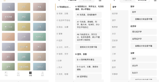 掌阅精选书籍提供三种分类方式,一是根据掌阅十余年的数字阅读行业经验,总结出21个大类、60个小分类的自有分类,方便读者查阅相关书籍;二是支持中图法分类,满足图书馆资源统计需求;三是提供学科分类,覆盖经济学、法学、历史学、理学、工学、农学等14个学科门类,可充分满足学生学习、老师教学与研究。