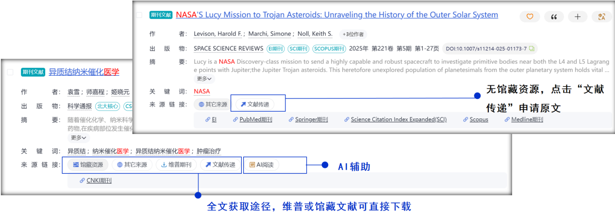 平台整合全球海量学术文献元数据,覆盖维普期刊元数据的同时涵盖WOS、EI、Scopus、PubMed、JCR、北大核心、CSSCI、CSCD等重要收录,支持13种文献类型(期刊论文、图书、专利、法规等);